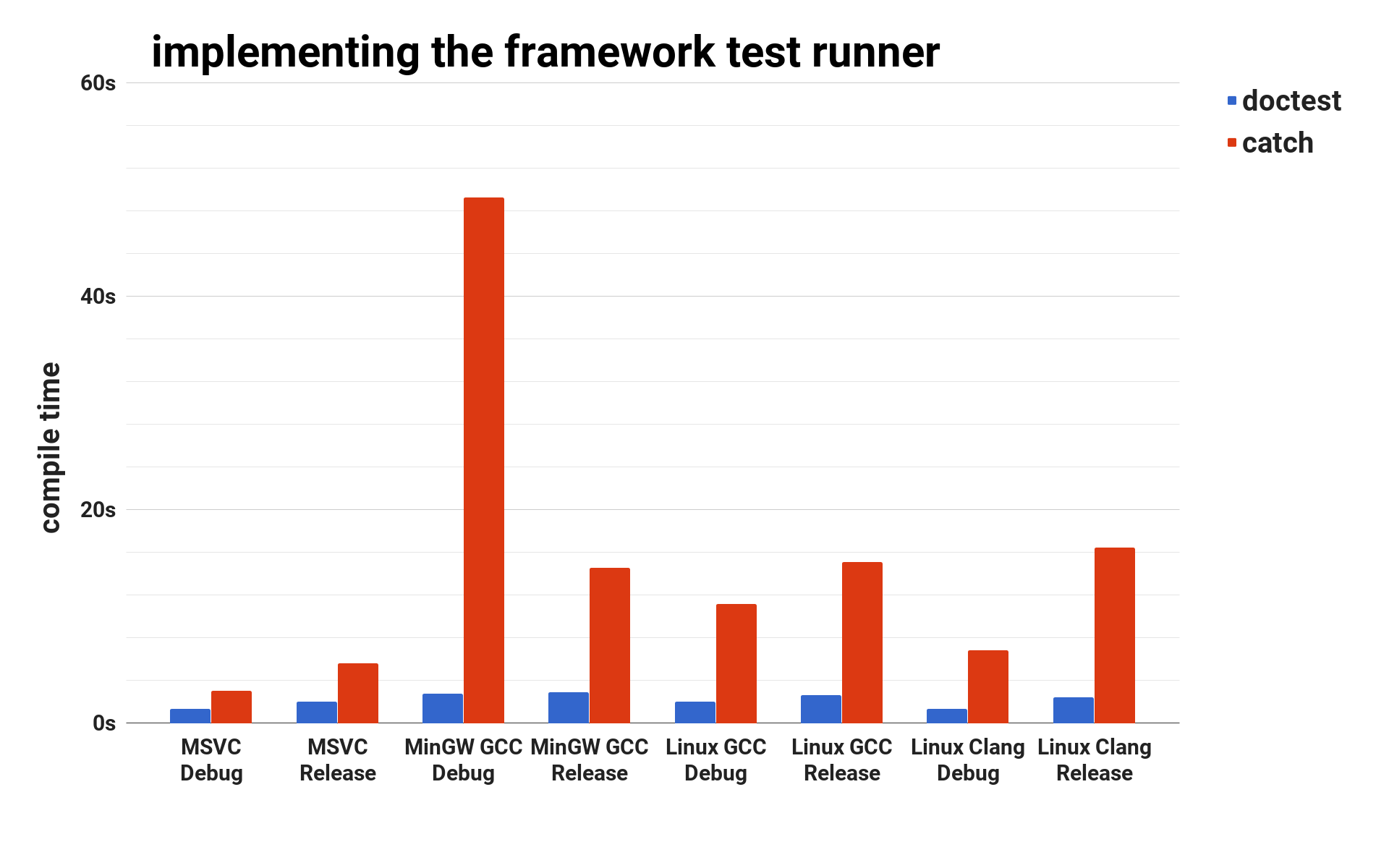 The results are in seconds and are in no way intended to bash Catch - the doctest framework wouldn’t exist without it.