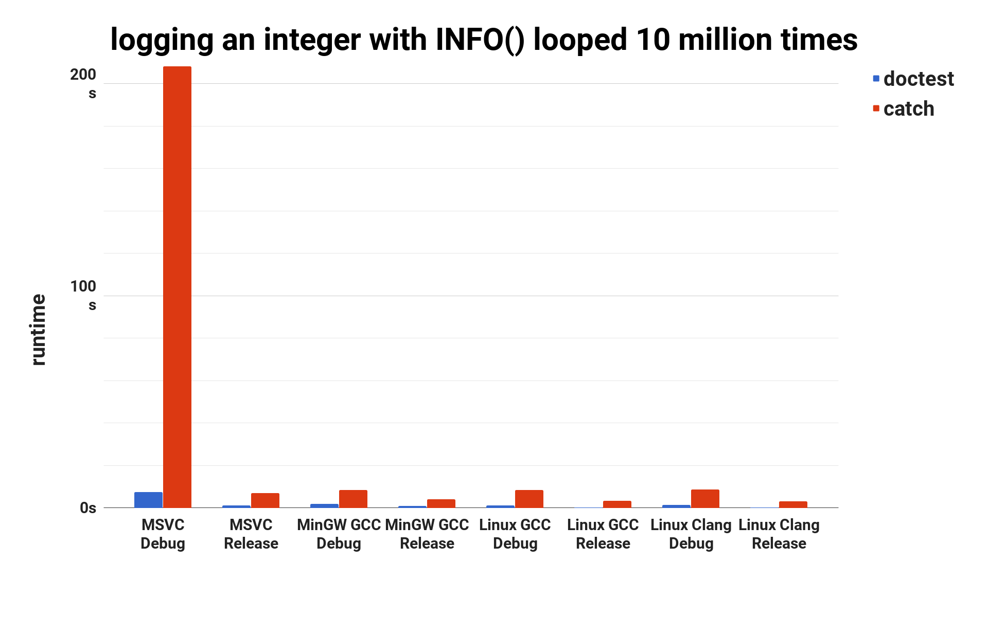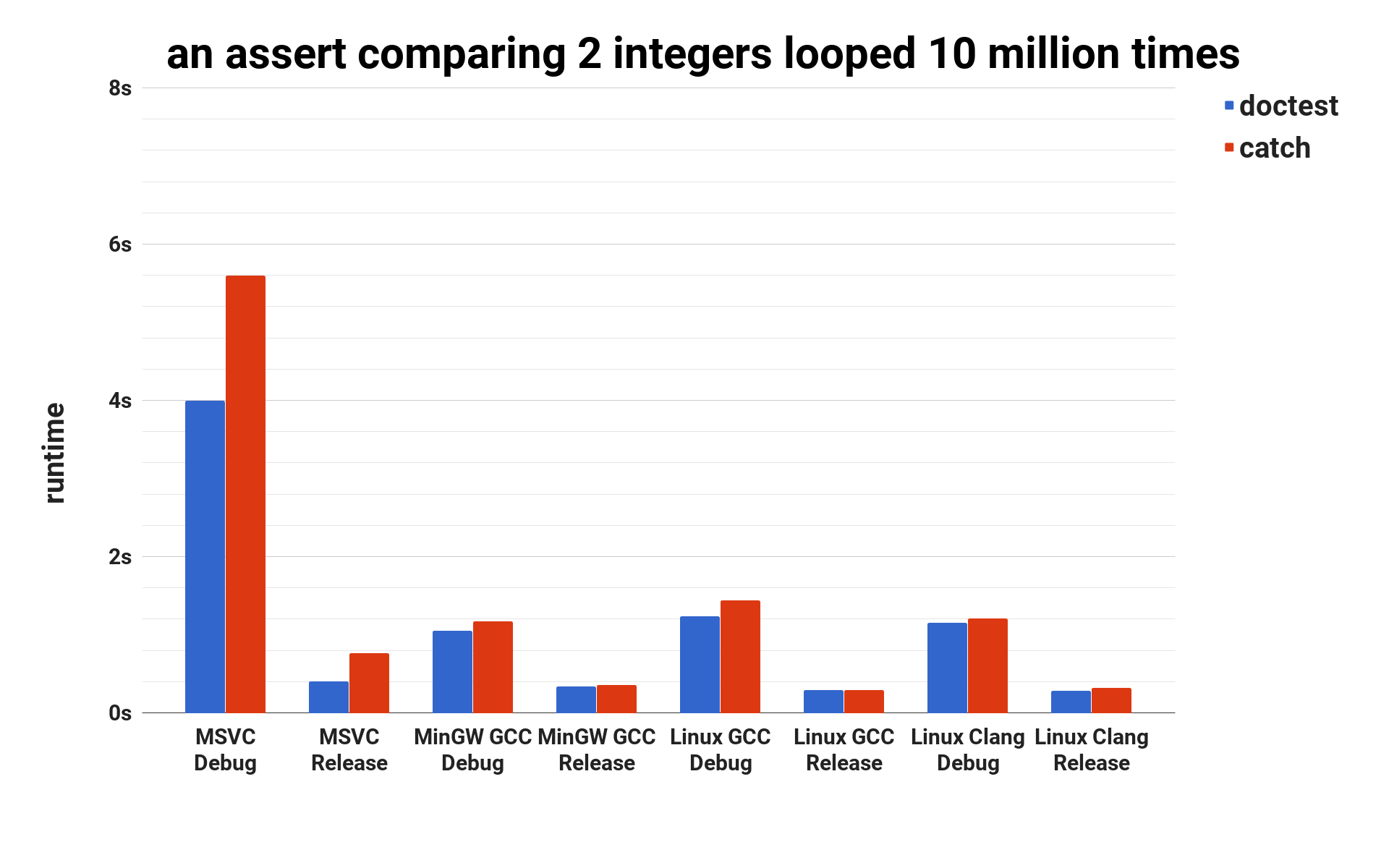 CHECK(a==b) assertsCHECK_EQ(a,b) with no expression decomposition - around 31-63% faster than CHECK(a==b)DOCTEST_CONFIG_SUPER_FAST_ASSERTS identifier makes the normal asserts faster by 57-68%DOCTEST_CONFIG_SUPER_FAST_ASSERTS identifier makes the binary asserts even faster by another 84-91%DOCTEST_CONFIG_DISABLE identifier the asserts just disappear as if they were never written - even lower than the baseline (because most of the implementation is also gone)CATCH_CONFIG_FAST_COMPILE results in 10-30% faster build times for asserts (and in one case 73%).CATCH_CONFIG_DISABLE identifier provides the same great benefits for assert macros as the doctest version (DOCTEST_CONFIG_DISABLE) - but not for the header costThe runtime benchmarks consist of a single test case with a loop of 10 million iterations performing the task - a single normal assert (using expression decomposition) or the assert + the logging of the loop iterator i: